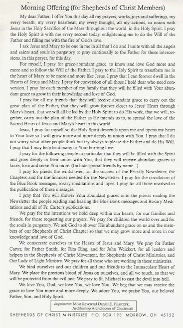 These apostles are to pray for the intentions I am giving you. For part of the hour they are to use the prayers of the Shepherds of Christ Associates Handbook. They may spend the rest of the hour as they so choose.