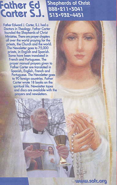 WE HAVE PRAYER CHAPTERS PRAYING ALL OVER THE WORLD for the priests, the Church, and the world. OUR PRIMARY FOCUS is the circulation of a newsletter. WE CIRCULATE A SPIRITUALITY NEWSLETTER written by Fr. Edward Carter, S.J., a Jesuit Theologian with a Doctor's degree in Theology and author of 17 books, to about 75,000 priests in the world in both English and Spanish. Father Carter has been a professor of Theology for over 30 years. Besides being sent to about 75,000 priests and bishops in the U.S.A., the newsletter is sent internationally to about 225 bishops, including 4 cardinals, who distribute copies to all of their priests, and also, in some cases, to their deacons and seminarians. The newsletter is centered in consecration to the Hearts of Jesus and Mary. It features writings regarding our union with Jesus and the Father and the Holy Spirit and Mary. The newsletter also stresses the Eucharist, the Church, prayer, and one's responsibility regarding the social order. The newsletter stresses sound doctrine as found in Scripture, the writings of the Popes and other Church documents. It also presents selected writings from the saints and competent priest-theologians and others. The newsletter can be used by all for development in the spiritual life centered in consecration. |